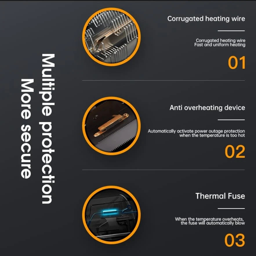 Built-in overheat protection and automatic shut-off ensure worry-free use.Energy-Saving Performance: Consumes low power while delivering maximum heat — ideal for home, office, or dorm use.Quiet Operation: Enjoy peaceful warmth without any noise or disturbance.